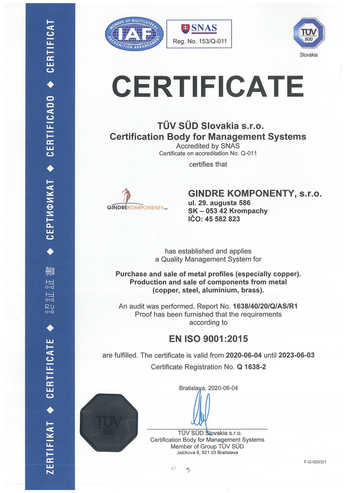 Výroba a predaj komponentov z kovu ako je meď, oceľ, hliník, mosadz.Potvrdením, že spoločnosť spĺňa požiadavky normy EN ISO 9001:2015 je vydanie certifikátu z recertifikačného auditu,